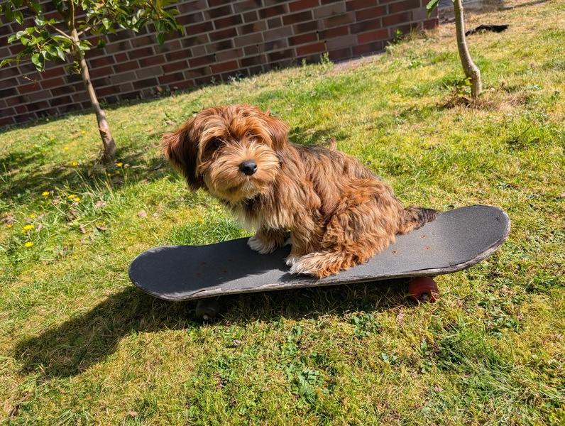 Sunny ist eine Tochter von Uno und Lova. Sie lernt gerade Skateboard fahren. Eine sehr schlaue und niedliche Hündin.